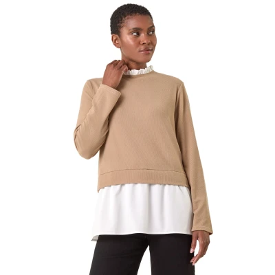 Frill Neck Contrast Jersey Top from Roman. Stay effortlessly stylish this Autumn Winter season with our versatile 2 in 1 top. Featuring a high frill neckline in a smart woven fabric, this top combines a jersey ribbed sweatshirt style top with a white woven shirt hem for a contemporary layered look. The long sleeves add extra warmth, making it perfect for the cooler months ahead. Pair with jeans and ankle boots for an easy outfit that transitions seamlessly from day to night!