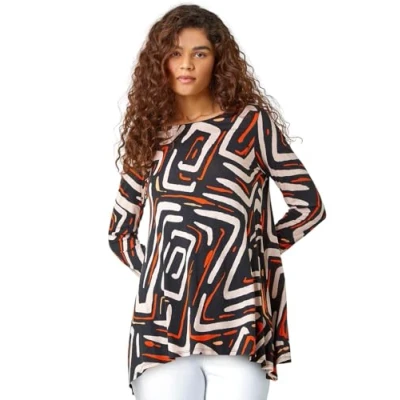 Secret SalesGeometric Back Detail Stretch Top from Roman. Brighten up your daytime wardrobe this Winter with this bold printed top. Cut from a stretch jersey fabric with a floaty tunic silhouette, this top features a modest round neckline and full-length sleeves. Designed to pull on overhead, this vibrant, graphic piece is sure to become a seasonal staple with its unique back bar cutout detail. Add some dark denim and boots for an Autumnal day out!