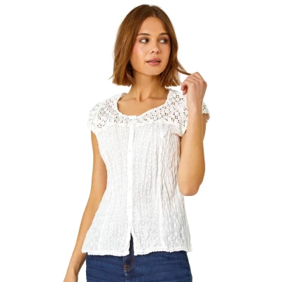 Secret SalesLace Yoke and Sleeve Crinkle Blouse from Roman. Add a delicate touch to your everyday basics with this lacy crinkle blouse. Featuring button down detailing and sweet cap sleeves, this top is crafted in 100% cotton and is slightly fitted to flatter your figure.