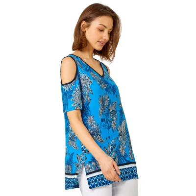 Roman Womens Paisley Border Print Cold Shoulder Top Blue Viscose Size 10 UK