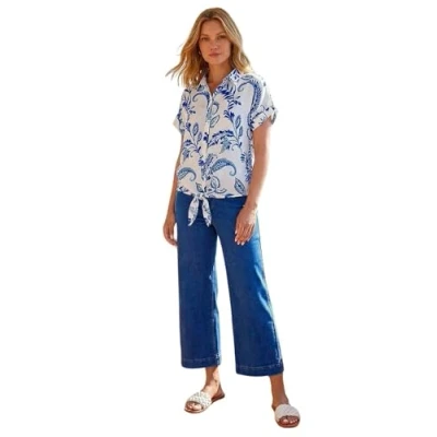 Add some fresh prints to your new season collection with this paisley print, tie front top. Cut from a cool woven fabric, this piece features a flattering v-neckline with a shirt collar and sweet, short sleeves. Button details adorn the front as well as a flattering tie at the waist to cinch in your figure. Pair with jeans or shorts with sandals for a Summer ready outfit in a flash! Please click our store link to visit the Roman shop and see our entire range.