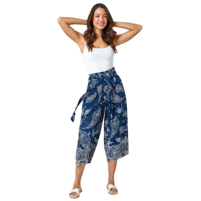Paisley Print Wide Leg Cropped Trousers from Roman. Elevate your daytime collection with these fabulous paisley print trousers. Designed in a wide-leg, cropped silhouette, these printed trousers bring vibrancy and print to your wardrobe. Designed with a self-tie fabric belt and an elasticated waistband, these trousers are comfortable and flattering. Wear with a simple white tee and sandals for a style perfect for long Summer days!