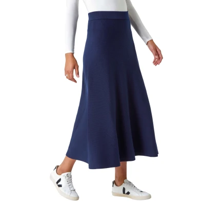 Roman Womens Plain Elastic Waist Knitted A Line Midi Skirt Navy Size 16 UK