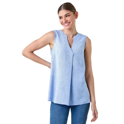 Featuring a v-neckline, this sleeveless single pleat detailed tank top looks great paired with just about anything A classic sleeveless vest top style that is a fabulous addition to your basics collection, perfect for layering. Style with cropped stretch trousers or jeans for those warm sunny days out or an even sunnier getaway. The length of this top is approx 73cm. Please click our store link to visit the Roman shop and see our entire range.