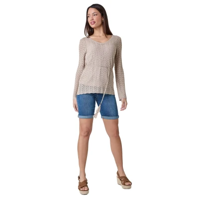 Secret SalesPointelle Tassel Detail V-Neck Knit Top from Roman. Elevate your summer wardrobe with this stunning tie waist pointelle jumper! Crafted from a fine knit fabric, this jumper features delicate pointelle detailing that adds an elegant touch to any outfit. The shimmer throughout gives it a touch of glamour whilst the v-neckline adds a flattering touch, combined with the tassel and bead trim on the tie they create a boho-inspired Summer staple. Whether you wear it over swimwear for a chic holiday cover-up or pair it with denim shorts and wedges for a casual daytime look, this jumper is a must-have for your summer wardrobe.