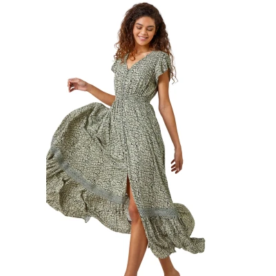 Roman Womens Scribble Print Button Through Maxi Dress Khaki Size 10 UK