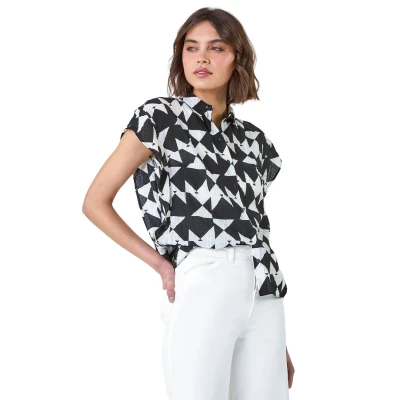 Short Sleeve Blouse from Roman. Add a touch of geometric flair to your wardrobe with this timeless collared blouse. The bold all-over print and shirt collar offers a classic yet contemporary look. Designed in a lightweight, crinkle textured fabric, this top boasts a button-front closure, short sleeves, and versatility that lets you wear it open over a cami or closed for a smart ensemble. Perfect with jeans and sandals, this blouse exudes effortless style for your everyday Spring adventures!
