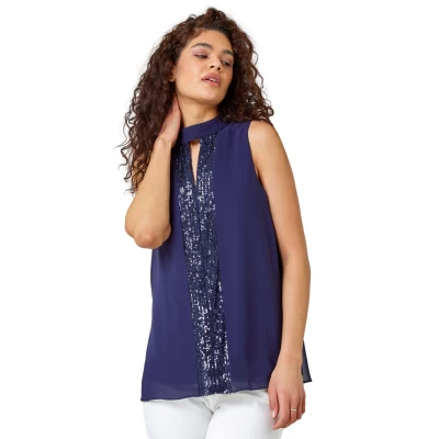 Roman Womens Sleeveless High Neck Sequin Top Navy Size 10 UK