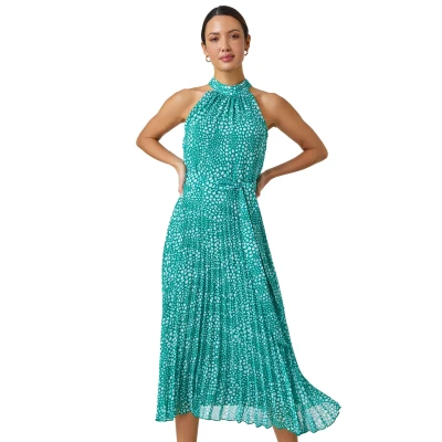 Spot Print Halter Neck Midi Dress from Roman. Get spotted this season in this spot print, halter neck midi dress. Cut from a smooth woven fabric, this dress features a sophisticated high neckline and is designed in a Summer-ready sleeveless shape. A self-tie fabric belt creates shape at the waist if desired, while the pleated skirt falls in a flattering fit and flare style to a modest midi length. Finished with a stylish concealed back zip, this is perfect for any upcoming occasion, just add heels!