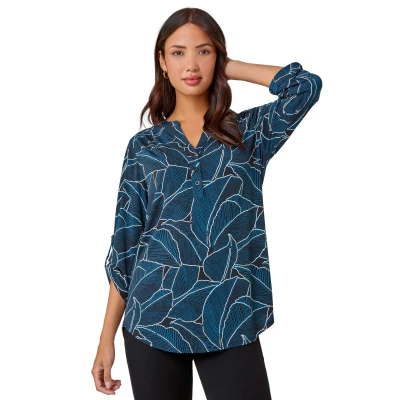 Roman Womens Textured Leaf Print Stretch Shirt Teal Size 10 UK