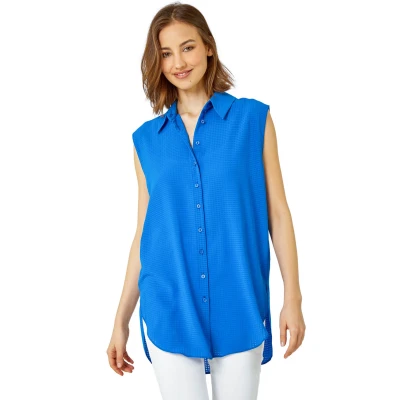 Textured Sleeveless Blouse from Roman. Cut from a unique textured fabric, this sleeveless blouse is perfect for the warmer months. Cut from a smooth woven fabric this piece features a fully open front complete with button fastenings. Designed in a sophisticated sleeveless style this piece is finished with a smart collared neckline. Pair with cropped jeggings and sandals for effortless Summer style or pair with smart trousers and courts for warm days at the office!