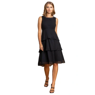 Roman Womens Tiered Embellished Neck Chiffon Dress Black Size 14 UK