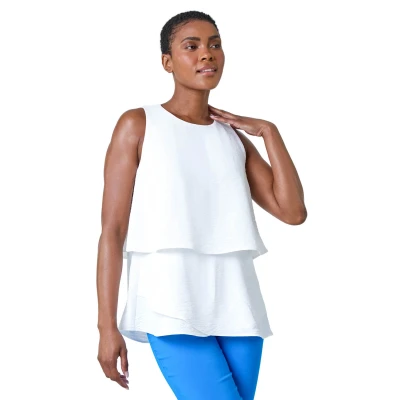 Tiered Sleeveless Vest Top from Roman. Elevate your summer wardrobe with this elegant and sophisticated layered round top. Crafted from a lightweight woven fabric, this top offers a flattering and effortless fit. The sleeveless design and round neckline create a timeless silhouette whilst the unique layered detail adds a unique touch to the top. Finished with a keyhole back and a button and loop fastening, this top is both stylish and secure. Style it with smart separates for a chic and polished look for the office.