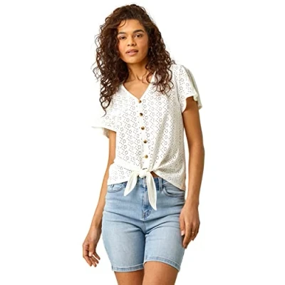 Secret SalesV-Neck Broderie Stretch Jersey Tie Front Top from Roman. Prepare for Spring Summer in style with the ultimate wardrobe refresher! This lightweight jersey top is the ultimate go-to casual look. Featuring a v-neckline, short sleeves, button through detail and flattering tie front, this cute everyday blouse is made from a floral broderie anglaise fabric. Pair it with colourful cropped trousers and summer sandals for a look that will take your from beach to bar!