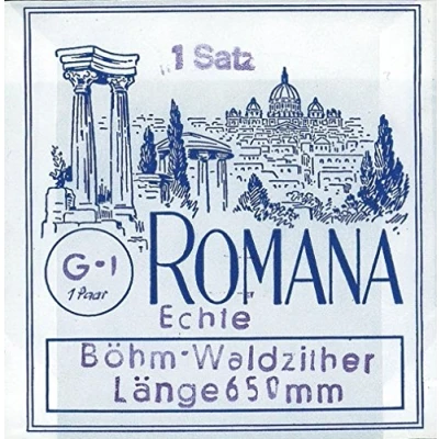 complete set, 9-string for Böhm-Waldzither (Hamburger Waldzither) with 2 loops, For scale length 470 mm, total length from loop to loop 650 mm. Other lengths up to 670mm as special order., treble strings (g1, e2) silver steel plain, wound strings steel, silver-plated copper wire. Set of 9 strings, with 2 slings., C tuning g'g' e'e' c'c' gg c, string gauges: g: 2x .011"/0,28mm , e: 2x .015"/0,38mm, c: 2x .020 "w/0,50mm g: 2x .072 "w/0.72mm , c: 1 x .040 "w/1.02mm