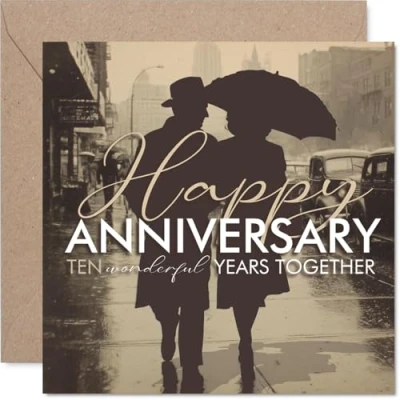 Captures ten wonderful years together with a charming silhouette of a couple sharing an umbrella, perfect for evoking fond memories and heartfelt smiles Features a romantic vintage motif in classic black and beige, adding a timeless touch that stands out on any mantelpiece or desk. Recyclable; printed in UK for a considerate choice Printed on glossy single-sided board with an uncoated inside-no smudging when writing inside. Made with FSC board for a feel-good, eco-friendly choice Inside message: Have a Lovely Day. Comes with a matching envelope, so it's ready to give straight away. The 145mm Square format is convenient to display or post Proudly designed and printed in the UK, using recyclable materials for a card that feels as good to send as to receive. Ideal for a mum or dad celebrating a milestone anniversary