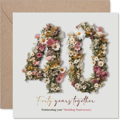 Celebrates four decades together with a romantic touch, featuring a floral arrangement shaped into the number 40 for a truly special milestone The design bursts with pink, white, yellow and green florals, making the card feel joyful and fresh for such a meaningful anniversary. Recyclable and printed in UK for a considerate choice Printed on quality gloss single sided board with an uncoated inside for easy writing. No smudging when writing inside. Printed on 360 micron stock for a confident, premium feel Blank inside, so you can craft your own personal message. Comes with a matching envelope for a polished finish. The 145mm Square format is convenient to display or post Proudly made in the UK using FSC-certified and fully recyclable materials, so you can feel good about your choice. Ideal for a mum or dad celebrating a milestone anniversary