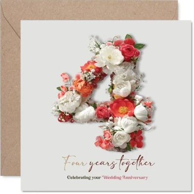 Celebrates four wonderful years together with a romantic touch - features a bold floral '4' that pops on the front, making it a true eye-catcher for their special day Beautifully illustrated with a lush arrangement of red. white. pink, and green flowers. the design symbolises growth and lasting love - ideal for couples who appreciate elegance Printed on quality. glossy single sided board with an uncoated inside for easy writing - no smudging when writing inside - using FSC certified, recyclable materials Blank inside, so you can share your personal message; comes complete with a matching envelope to make gifting effortless. The 145mm Square format is convenient to display or post Lovingly made in the UK, this card is crafted for those who want to mark meaningful occasions with style and a little flourish. Ideal for a husband or wife celebrating a milestone anniversary