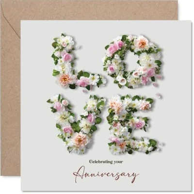 Captures the romance of your special day with 'LOVE' beautifully arranged in lush florals on the front - a visual treat for the happy couple Showcases a charming mix of pink, white, and green flowers crafted into lettering for a classic yet eye-catching motif. Recyclable and printed in UK for a considerate choice Printed on glossy single sided board with an uncoated inside; no smudging when writing inside. Made with FSC certified board and fully recyclable Blank inside - plenty of space for your own message. Includes a quality envelope for easy gifting. The 145mm Square format is convenient to display or post Confidently chosen for its UK-made quality and elegant design, perfect for marking cherished anniversaries with flair. Ideal for a mum or dad celebrating a milestone anniversary