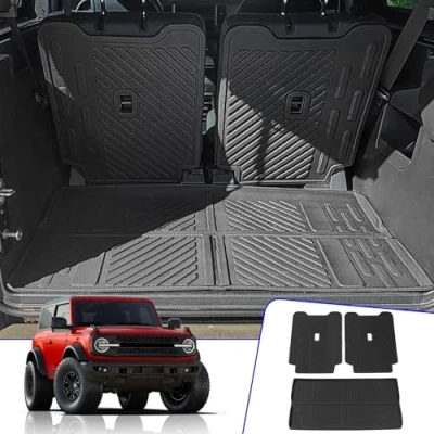 Fitment: Trunk Mat and Backrest mats are specifically Designed for 2021 2022 2023 2024 2025 Ford Bronco 2 Door.Note: Doesn’t fit Bronco Sport or Bronco 4 Door model. Function: Protect the interior of the original car from damage and look more beautiful,easily wipe dirt clean.There are three mats in total, including one trunk mat and two backrest mats. Material: Back Seat Covers and Cargo Liner are made of high-quality TPE material,odorless,flexible and durable.Let you and your family stay healthy inside the car. Installation:There are Velcro on the back of the back liner, which can be pasted on the seat back. It is directly installed on the car, no other tools are required, it is quick and convenient, and it can be taken out for washing. Warranty:If product is broken during shipping or normal use within 30 days,we can arrange a new one for free.
