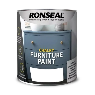 General description Ronseal Chalky Furniture Paint in Midnight Blue offers a high-performance chalk effect finish that is flat and matte. This paint is designed to protect furniture, doors, and cupboards against wear, tear, scuffs, and scratches without the need for additional coatings like wax or lacquer. Ideal for upcycling projects, it refreshes old furniture with a stylish chalky look. Technical specifications Colour: Midnight Blue Finish: Chalky Matt Size: 750ml Coverage: 6 m² per litre Touch dry in approximately 30 minutes Compatibility and accessories Suitable for furniture, doors, cupboards, and other interior wood or similar surfaces No primer or protective coating required Installation Apply directly to clean, dry surfaces No need for primer or base coat Usage Use for furniture upcycling, renovation, or decorative projects Apply with a brush or roller for an even finish Other information