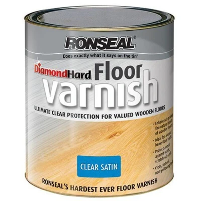 General description Ronseal Diamond Hard Floor Varnish is perfect for any wooden floor, providing robust protection against heavy foot traffic, knocks, scuffs, and scratches. Its non-yellowing formulation enhances the natural beauty of the wood, ensuring a long-lasting finish. The varnish dries to the touch in just 30 minutes, allowing for quick re-use of the floors. Technical specifications Finish: Satin Size: 5 Litre Coverage: Up to 18m² per litre Drying time: Touch dry in 30 minutes Re-coat time: 2 hours Number of coats: 3 Application: Brush Varnish base: Water Durability: Diamond hard protection against daily scuffs and knocks VOC: Low Installation Ensure the room temperature is above 10 degrees Celsius. Remove furniture and open doors and windows for ventilation. For unvarnished floors, sand along the length of the floorboards with 120 grit sandpaper. For previously varnished floors, lightly sand with 120 grit sandpaper and remove any flaking varnish. Wipe the floor down with