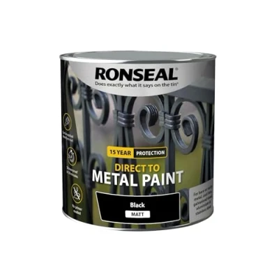 General description Ronseal Direct to Metal Paint is a high-quality, water-based paint that provides a tough and durable finish to metal surfaces. It offers 15 years of protection and can be applied directly to rust without the need for a primer, making it an ideal choice for various metal applications. Technical specifications Size: 2.5 litres Coverage: Up to 8m² per litre Dry time: Showerproof in 30 minutes Coat time: 2-4 hours Number of coats: 2-3 coats recommended for maximum protection Colours available: Black, White, Steel Grey, Storm Grey, Rural Green, Chilli Red Finish: Matt Durability: 15-year protection Application methods: Brush, roller, or sprayer Base: Water VOC: Low Installation Before applying the paint, ensure the metal surface is clean, dry, and free from dirt, dust, and grease. For bare metal, remove loose rust or paint with a wire brush or 120 grit sandpaper, then wipe down with a damp cloth. For previously painted metal, lightly sand if the paint is in good