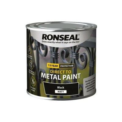 General description Ronseal Direct to Metal Paint is a high-quality, water-based paint designed for durability and long-lasting protection. It can be applied directly to rust and requires minimal surface preparation, making it suitable for both indoor and outdoor use. This paint provides a tough finish that lasts up to 15 years. Technical specifications Colour: Black Size: 250ml Type: Direct To Metal - Matt Coverage: Up to 8m² per litre Dry time: Showerproof in 30 minutes Recoat time: 2-4 hours between coats Number of coats: 2-3 coats recommended for maximum protection Base: Water-based VOC: Low Compatibility and accessories Compatible with various metals including steel, cast iron, aluminium, and stainless steel Can be used on wood and PVC surfaces Suitable for application with brushes, rollers, or spray equipment Installation Ensure the surface is clean, dry, and free from dirt, dust, and grease Remove loose rust or paint with a wire brush or sandpaper For previously painted
