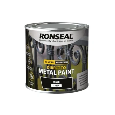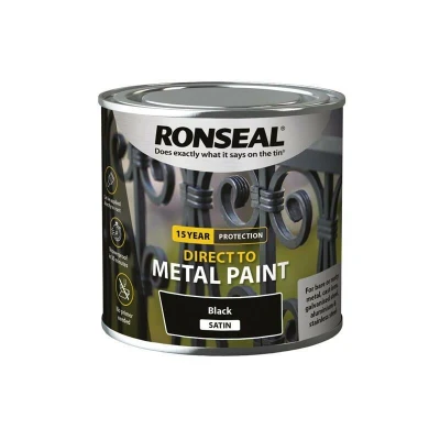 General description Ronseal Direct to Metal Paint is a high-quality, water-based paint that provides a tough and durable finish for metal surfaces. It can be applied directly to rust without the need for a primer, making it easy to use. This paint offers 15 years of protection and is suitable for both indoor and outdoor metal items. Technical specifications Usage: Suitable for bare metal, cast iron, galvanised steel, aluminium, stainless steel, wood, and PVC Coverage: Up to 8m² per litre Dry time: Showerproof in 30 minutes Coat time: 2-4 hours between coats Number of coats: 2-3 coats recommended for maximum protection Colours: Black, White, Steel Grey, Storm Grey, Rural Green, Chilli Red Finish: Gloss, Satin, or Matt Durability: 15-year protection Application methods: Brush, roller, or sprayer Base: Water-based Sizes available: 250ml, 750ml, 2.5L VOC: Low Installation Ensure the metal surface is clean, dry, and free from dirt, dust, and grease before painting Remove loose rust or