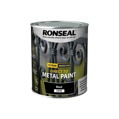 General description Ronseal Direct to Metal Paint is a high-quality, water-based paint designed to provide a tough and durable finish for metal surfaces. It can be applied directly to rust without the need for a primer, making it ideal for minimal preparation. This paint is suitable for both indoor and outdoor use, offering excellent protection against corrosion and weathering, with a durability of up to 15 years. Technical specifications Type: Direct to Metal - Satin finish Color: Black (other colors available) Size: 750ml Coverage: Up to 8m² per litre Dry time: Showerproof in 30 minutes Recoat time: 2 to 4 hours between coats Number of coats: 2-3 coats recommended for maximum durability Durability: 15-year protection Application methods: Brush, roller, or sprayer (dilute with about 10% water for spraying) Base: Water-based VOC: Low Compatibility and accessories Suitable for use on a variety of surfaces including metal, cast iron, galvanised steel, aluminium, stainless steel, wood,