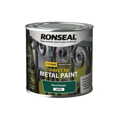 General description Ronseal Direct to Metal Paint is a high-quality, water-based paint designed for durable and long-lasting finishes on metal surfaces. It can be applied directly to rust without the need for primer and provides up to 15 years of protection. The paint is quick-drying, showerproof in 30 minutes, and suitable for both indoor and outdoor use. Technical specifications Colour: Green Size: 250ml Type: Direct to Metal - Satin Coverage: Up to 8m² per litre Dry time: Showerproof in 30 minutes Recoat time: 2-4 hours between coats Number of coats: 2-3 coats recommended for maximum protection Durability: 15-year protection Application methods: Brush, roller, or sprayer Base: Water-based VOC: Low Compatibility and accessories Compatible with various metal surfaces including rusted areas, cast iron, aluminium, and steel Can be used with brushes, rollers, or spray equipment Installation Ensure the surface is clean, dry, and free from dirt, dust, and grease Remove loose rust or paint