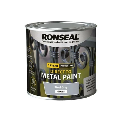 General description Ronseal Direct to Metal Paint is a high-quality, water-based paint that provides a tough and durable finish to metal surfaces. It can be applied directly to rust without the need for a primer, making it ideal for both indoor and outdoor use. This paint offers quick recoat times and is showerproof in just 30 minutes, ensuring convenience and long-lasting protection. Technical specifications Colour: Grey Size: 250ml Type: Direct to Metal - Gloss Coverage: approximately 8m² per litre Dry time: showerproof in 30 minutes Recoat time: 2-4 hours between coats Number of coats: 2-3 for optimal protection Finish options: gloss, satin, matte Durability: up to 15 years Application methods: brush, roller, or sprayer Base: water-based Sizes available: 250ml, 750ml, 2.5L VOC level: low Compatibility and accessories Suitable for use on bare metal, cast iron, galvanised steel, aluminium, stainless steel, wood, and PVC Can be used on previously painted surfaces if in good condition