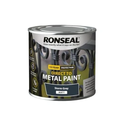 General description Ronseal Direct to Metal Paint is a high-quality, water-based paint designed for durability and long-lasting protection. It can be applied directly to rust and requires minimal preparation, making it suitable for both indoor and outdoor use. This paint provides a tough finish that lasts up to 15 years. Technical specifications Colour: Grey Size: 250ml Paint Type: Direct to Metal - Matt Coverage: approximately 8m2 per litre Dry time: showerproof in 30 minutes Recoat time: 2-4 hours between coats Number of coats: 2-3 coats recommended for maximum protection Application methods: brush, roller, or sprayer Base: water-based VOC level: low Compatibility and accessories Suitable for use on bare metal, cast iron, galvanised steel, aluminium, stainless steel, wood, and PVC Installation Ensure the surface is clean, dry, and free from dirt, dust, and grease Remove loose rust or paint with a wire brush or sandpaper For previously painted surfaces in good condition, lightly sand