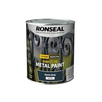 General description Ronseal Direct to Metal Paint is a high-quality, water-based paint that provides a tough and durable finish for metal surfaces. It is designed to be applied directly to rust without the need for a primer, making it ideal for various DIY projects. This paint offers long-lasting protection with a durability guarantee of up to 15 years and is suitable for both indoor and outdoor use. Technical specifications Type: Direct to Metal - Satin finish Colour: Storm Grey Size: 750ml Coverage: Approximately 8m² per litre Dry time: Showerproof in 30 minutes Recoat time: 2-4 hours between coats Number of coats: 2-3 coats recommended for maximum protection Base: Water-based VOC: Low Compatibility and accessories Suitable for use on: Bare metal, cast iron, galvanised steel, aluminium, stainless steel, wood, and PVC Compatible with various painting tools: brushes, rollers, and sprayers Installation Ensure the surface is clean, dry, and free from dirt, dust, and grease before