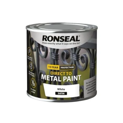 General description Ronseal Direct to Metal Paint is a high-quality, water-based paint designed specifically for metal surfaces. It provides a tough and durable finish, allowing for direct application on rust without the need for a primer. This paint is suitable for both indoor and outdoor use, offering excellent protection with a quick recoat time and showerproof capabilities in just 30 minutes. Technical specifications Usage: Suitable for interior and exterior bare metal, cast iron, galvanised steel, aluminium, stainless steel, wood, and PVC Coverage: Approximately 8m² per litre Dry time: Showerproof in 30 minutes Recoat time: 2-4 hours between coats Number of coats: 2-3 coats recommended for maximum protection Colors: Black, White, Steel Grey, Storm Grey, Rural Green, Chilli Red Finish options: Gloss, Satin, Matt Durability: Up to 15 years of protection Application methods: Brush, roller, or sprayer (dilute with about 10% water for spraying) Base: Water-based Sizes available: