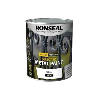 General description Ronseal Direct to Metal Paint is a high-quality, water-based paint designed to provide a tough and durable finish for metal surfaces. It can be applied directly to rust without the need for a primer, making it ideal for quick and efficient projects. This paint offers excellent protection and a professional finish, suitable for both indoor and outdoor use. Technical specifications Colour: White Size: 750ml Type: Direct to Metal - Satin finish Coverage: Up to 8m² per litre Dry time: Showerproof in 30 minutes Recoat time: 2 to 4 hours between coats Number of coats: 2-3 coats recommended for maximum durability Durability: Provides 15 years of protection Application methods: Brush, roller, or spray Base: Water-based VOC: Low Installation Ensure the surface is clean, dry, and free from dirt, dust, grease, and loose rust or paint. Remove loose rust or paint with a wire brush or sandpaper (120 grit for rust, 240 grit for previously painted surfaces). Wipe the surface with