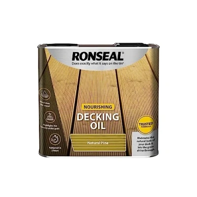 General description Ronseal Decking Oil nourishes and protects decking, leaving a lightly tinted finish. It defends against all weather conditions, restores the wood's natural oils, and prevents color fading while protecting from scuffs and scratches. Technical specifications Finish: Natural Pine Size: 2.5 Litre Coverage: 10m² / Litre Number of Coats Required: 2 Usage Application Method: Brush Other information Supplied in a tin with a re-sealable lid and easy pour handle.