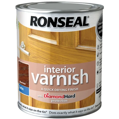 General description Ronseal RSLIVSDO750 Interior Varnish Satin Dark Oak is a quick-drying varnish that provides diamond hard protection for your wooden surfaces. It offers superior defense against heat, scratches, and water, ensuring a beautiful, fade-resistant finish for all interior wood. This varnish is available in Satin, Gloss, and Matt finishes. Technical specifications Size: 750ml Touch dry in: 20 minutes Recoat after: 2 hours Installation Ensure the room is warm and well-ventilated. Wear a mask while sanding to avoid inhaling dust. Prepare the wood by wiping it down with a cloth and white spirit to remove any wax, grease, dirt, and oil. Sand the surface with 120 grit sandpaper to smooth out rough patches. If there is an old coating, sand away any peeling or flaking areas for an even surface. Let the dust settle and wipe it away with a damp cloth before varnishing. Usage Stir the varnish well before use to smooth out lumps. Test the color on a hidden patch to ensure