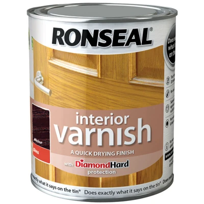 General description This Ronseal Interior Varnish Quick Dry Gloss Walnut is a high-quality varnish designed to enhance the natural beauty of wood while providing durable protection. It dries quickly, becoming touch dry in just 20 minutes, and offers a beautiful, fade-resistant finish that is ideal for various interior wood surfaces, including furniture and skirting boards. Technical specifications Size: 750ml Finish: Gloss (also available in Satin and Matt) Drying time: Touch dry in 20 minutes, recoat after 2 hours Protection: Diamond hard, resistant to scratches, heat, and water Compatibility and accessories Suitable for bare or previously varnished wood surfaces Not suitable for painted wood Recommended tools: brushes or rollers for application Installation Prepare the surface by cleaning with a cloth and white spirit to remove grease and dirt. Sand the surface with 120 grit sandpaper to smooth out rough patches and remove old coatings. Wipe away dust with a damp cloth and allow the
