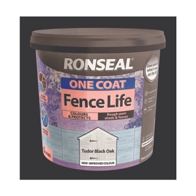 Ronseal One Coat Fence Life gives colour and protection to rough sawn sheds and fences for up to two years, in just one coat.• Colours and protects rough sawn wood• All weather protection• 100% showerproof in 1 hour• Apply by brush or spray• Protects your wood from greyingHow To Paint Your FenceBefore You StartYou can’t use this stain on decking, garden furniture or other smooth planed wood. We have other products to help you with that.Cold wet weather stops the stain from drying and could wash it off. So make sure it’s a warm day with the temperature above 10°C and no rain is forecast.The wood needs to be clean and dry so the stain can soak in properly. To clean the wood, use a stiff brush to get rid of any dirt.If you want to cover up a bright, strong or contrasting colour, you’ll need to use extra coats. This stain is safe to use around plants and pets.ApplicationYou can either brush or spray your stain.BrushingGet lots of stain on your brush and apply a thick coat to your wood but don’t spread it too far.After one hour, it will be 100% showerproof. It takes 4 hours to dry fully.If your wood is weathered, you may need to apply a second coat. After the first coat has dried, review it to see if you need a second one.SprayingPour the liquid into the tank.Pump it up or turn it on and start spraying. Use long, sweeping, horizontal arm movements for an even finish.Move along the full width of the fence panel, drop down and repeat the process. Overlap each pass by 50% for even coverage.AftercareMaintenanceRegularly inspect your wood for signs of damage. If you notice any, just apply another coat of the stain to protect the wood.CleaningRemove as much stain off your brush as possible and then clean them in warm soapy water.You should never pour the leftover stain down drains or watercourses. Instead, contact your local council for ways to safely dispose of it.Technical Specification:Usage: New or previously stained rough sawn woodCoverage: 6m² per litre. 5L will cover up to 6 fence panelsDry time Rainproof in one hour, completely dry in four hoursCoat time: Four hours, if necessaryNumber of coats: OneFinish: MattDurability: Protects from rain and won’t grey in the sunshine so colour lasts for up to two yearsApplication: Brush or sprayVOC: Low