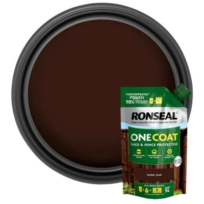 General description The Ronseal One Coat Shed & Fence Refill Pouch in Dark Oak (950ml) is a convenient solution for maintaining your outdoor wood surfaces. This refill pouch allows you to mix the product with water at home, providing an easy and lightweight alternative to traditional buckets. It is designed for quick application, whether brushed or sprayed, and offers durable protection against various weather conditions. Technical specifications Volume: 950ml Makes: 5 litres of Shed & Fence Protector Usage Can be applied in one coat Suitable for brushing or spraying Provides lasting colour and protection for up to 2 years