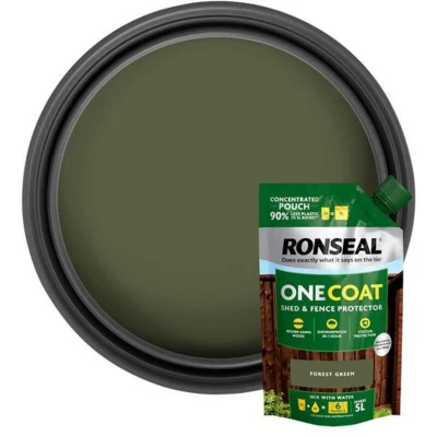 General description The Ronseal One Coat Shed & Fence Refill Pouch in Forest Green (950ml) is designed for easy use and convenience. This refill pouch allows you to mix the product with water at home, making it a perfect solution for replenishing your existing supply without the need for heavy buckets. It provides lasting color and protection for up to 2 years against various weather conditions. Technical specifications Volume: 950ml Makes: 5 litres of Shed & Fence Protector Usage Can be brushed or sprayed on in one coat. Provides protection against rain, frost, snow, and sun.