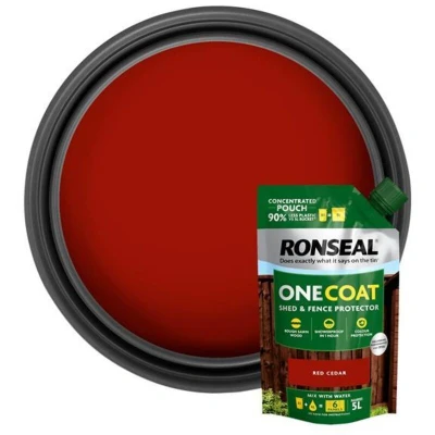 General description The Ronseal One Coat Shed & Fence Refill Pouch in Red Cedar (950ml) is designed for easy use and convenience. This refill pouch allows you to mix the product with water at home, providing the same quality as the ready-mixed buckets. It's an ideal solution for those looking to refill their existing buckets without the hassle of purchasing multiple heavy containers. Technical specifications Volume: 950ml Makes: 5 litres of Shed & Fence Protector Usage Can be brushed or sprayed on in one coat Provides lasting colour and protection for up to 2 years Resistant to rain, frost, snow, and sun