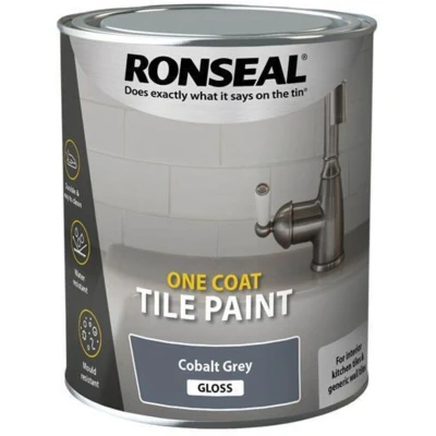General description Ronseal One Coat Tile Paint rejuvenates old tiled surfaces, providing a fresh new look without the need to re-tile. This water-based paint is ideal for kitchen and bathroom tiles, offering a durable, waterproof, and mould-resistant finish. It is suitable for bare or previously painted tiles and does not require a primer. Technical specifications Colour: Cobalt Grey Finish: Gloss Size: 750ml Type: Tile paint Coverage: Approximately 8m² per litre Drying time: Touch dry in 1 hour; overcoat in 4 hours if needed Number of coats: Usually one coat; a second coat may be required for porous surfaces VOC content: Low Installation Ensure room temperature is above 10°C and ventilate the area during application. Clean tiles thoroughly to remove dust, grease, and dirt; repair any damaged grout. Stir the paint well before use. Apply with a synthetic brush or roller, using up-and-down strokes for a smooth finish. Allow the first coat to dry for 1 hour; if necessary, apply a second