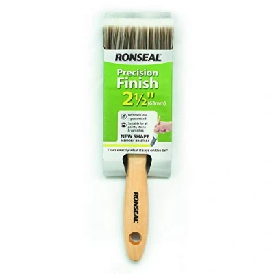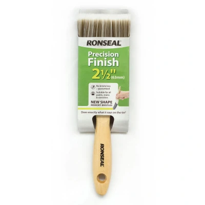 General description Guaranteed not to leave bristles in your paint, the Ronseal Precision Finish Brush - 2.5 Inch features shaped bristles for accurate application. It is designed for use with all stains, paints, and varnishes, ensuring a great finish every time. Technical specifications Size: 2.5 Inch Material: Responsibly sourced, Forest Friendly timber Bristles: Synthetic, designed to hold lots of paint Usage This brush is ideal for covering large areas quickly and accurately with various types of paint and finishes.