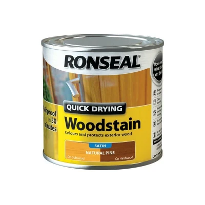 General description Ronseal Quick Drying Woodstain is a semi-transparent satin finish woodstain available in a re-sealable tin. It is designed to enhance the natural beauty of exterior wood surfaces while providing waterproofing and protection against the elements. This woodstain is suitable for both softwood and hardwood, making it ideal for doors, window frames, and other outdoor woodwork. Technical specifications Colour: Natural Pine Size: 250ml Coverage: Up to 20m² per litre Dry time: Rainproof in 30 minutes, fully dry in approximately 4 hours Number of coats: Typically 2-3 coats recommended Finish: Satin or gloss Application: Brush Base: Water-based Sizes available: 0.25L, 0.75L, 2.5L VOC: Low Compatibility and accessories Suitable for exterior wood surfaces such as doors, window frames, fences, and garden furniture Can be applied over bare or previously stained wood Use with suitable brushes for best results Installation Ensure the wood surface is clean, dry, and free from dust,