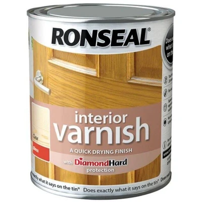 General description Ronseal Interior Varnish Quick Dry Gloss Clear is a quick-drying, diamond-hard protective finish designed for interior wood surfaces. It provides a durable, water, scratch, and heat-resistant coating that enhances the natural beauty of the wood while offering long-lasting protection. The varnish dries to a clear, glossy finish and is suitable for use on bare or previously varnished wood, but not on painted surfaces. Technical specifications Color: Clear Finish: Gloss (also available in satin and matte) Size: 250ml Drying time: Touch dry in 20 minutes, recoating after 2 hours Protection: Diamond Hard, resistant to water, scratches, and heat Compatibility and accessories Suitable for interior wooden surfaces such as furniture, skirting boards, and other woodwork Not suitable for painted wood surfaces Can be used over bare or previously varnished wood Installation Ensure the room is warm and well-ventilated before application Prepare the wood by cleaning with a cloth