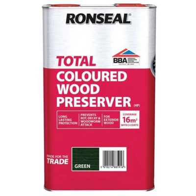 General description Ronseal Trade Total Wood Preserver is a traditional, highly penetrative wood preserver that provides long-lasting protection to exterior wood. It is specifically designed to prevent rot, decay, and woodworm attacks, making it ideal for use on sheds and fences. Technical specifications Colour: Green Size: 5 litre Coverage: 16m² with 3 coats MPN: RSLTTWPGR5L EAN: 5010214885916 Other information