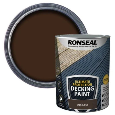 General description Ronseal Ultimate Protection Decking Paint transforms all types and ages of decking, filling in small cracks and covering grey wood. It rescues tired decks by providing long-lasting, all-weather protection while smoothing rough surfaces and locking down splinters. Technical specifications Colour: English Oak Size: 5 litre MPN: RSLDPEO5L EAN: 5010214891498 Coverage: 2m² per litre Number of Coats Required: 2 Usage Application Method: Brush or Pad Other information
