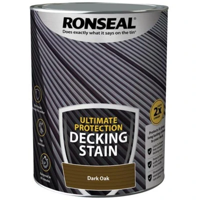 General description Ronseal Ultimate Protection Decking Stain is designed to keep your deck protected from the weather and everyday wear and tear. This stain not only enhances the appearance of your deck but also provides added slip resistance, ensuring safety during wet conditions. It lasts twice as long as standard decking stains, making it a durable choice for outdoor surfaces. Technical specifications Colour: Dark Oak Size: 5 litres MPN: RSLNUDSDO5L EAN: 5010214891139 Coverage: 6.4 m² per litre Number of Coats Required: 2 Usage Application can be done using a brush or pad. The stain is rainproof within 90 minutes, allowing for quick application even in unpredictable weather. Other information